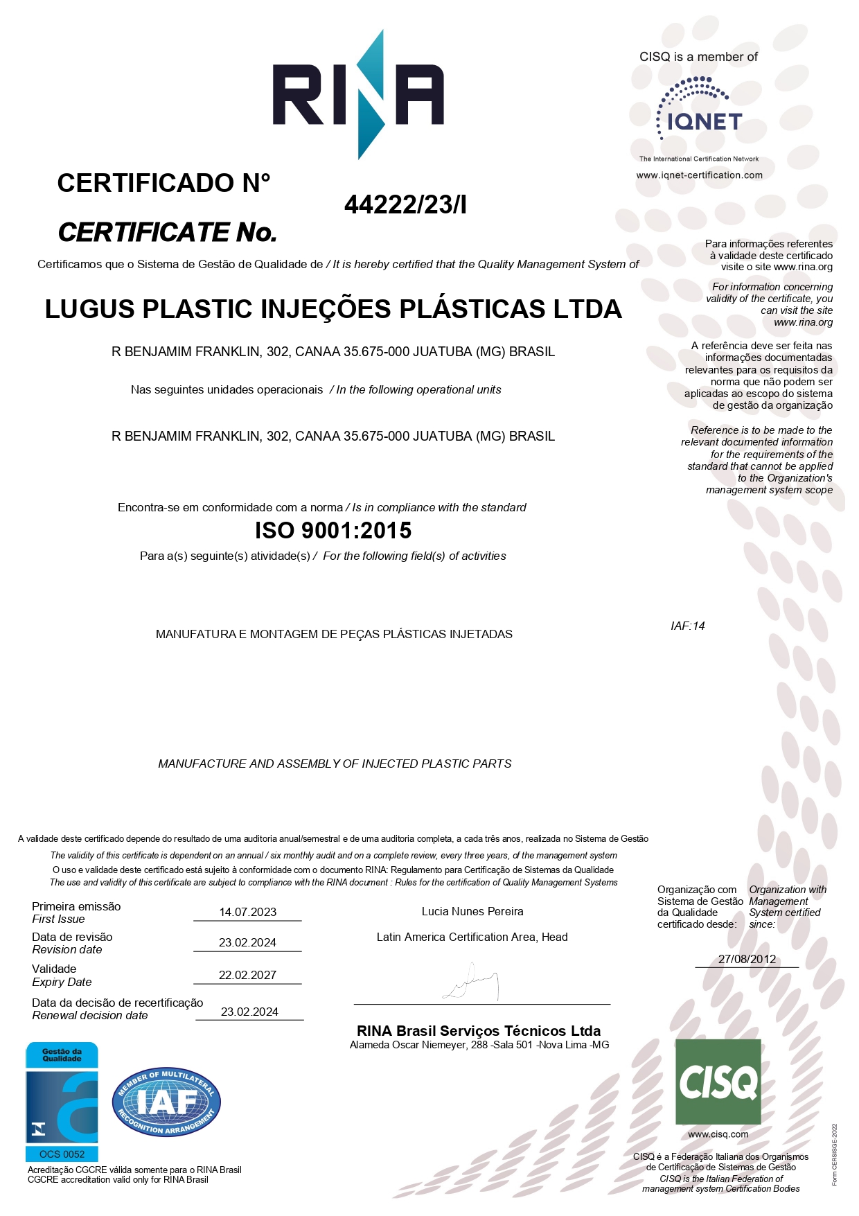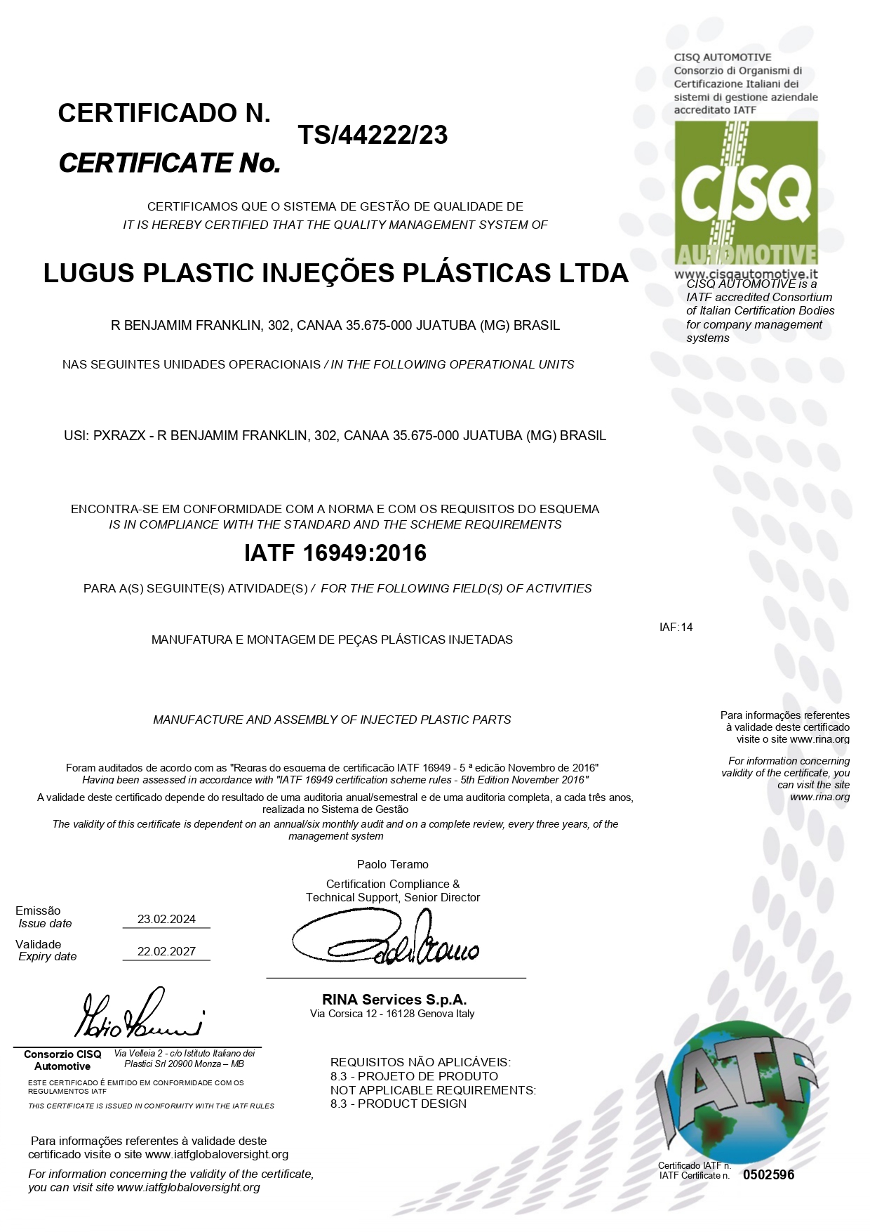 Em 2023 fomos certificados IATF 16.949:2016 para melhor atender as exigências dos nossos clientes da cadeia automotiva. Nossos processos seguem as diretrizes determinadas pela CQI-23 (Série de requisitos específicos dos processos de moldagem/injeção elaborados pela AIAG organização mundial criada para enfrentar e